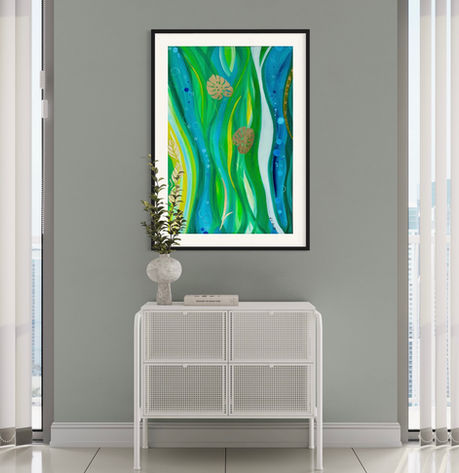 A mesmerizing blend of blues, greens and gold dance in fluid motion capturing the serenity of underwater world