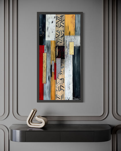 Arrangement of rectangles in varied red, yellow and crimson hues, patterns, textures and shades inviting endless exploration