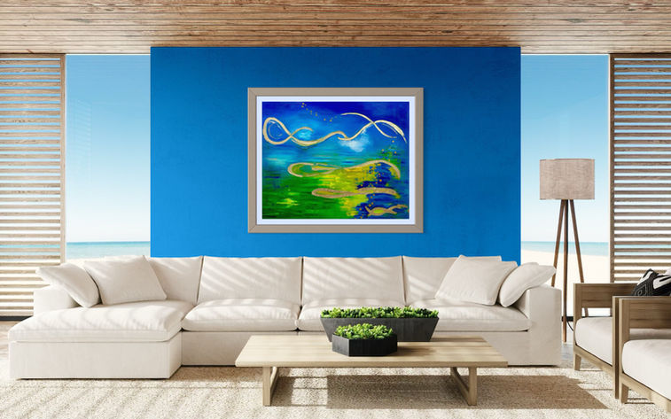 A vibrant abstract painting capturing the fluidity of water with swirls and splashes of blues and greens.